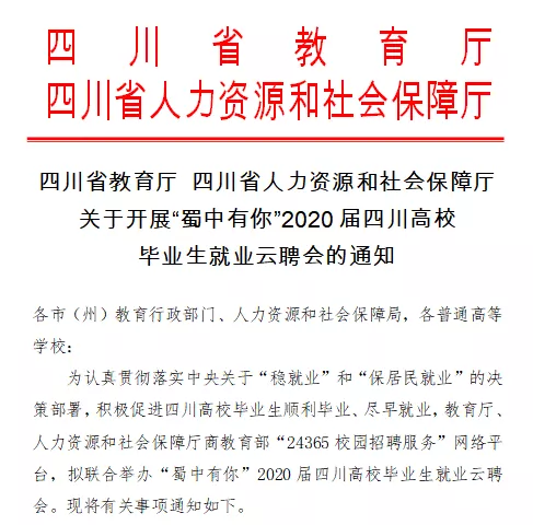 为认真贯彻落实中央关于“稳就业”和“保居民就业”的决策部署,积极促进四川高校毕业生顺利毕业、尽早就业,近日,教育厅、人力资源和社会保障厅商教育部“24365校园招聘服务”网络平台,拟联合举办“蜀中有你”2020届四川高校毕业生就业云聘会。