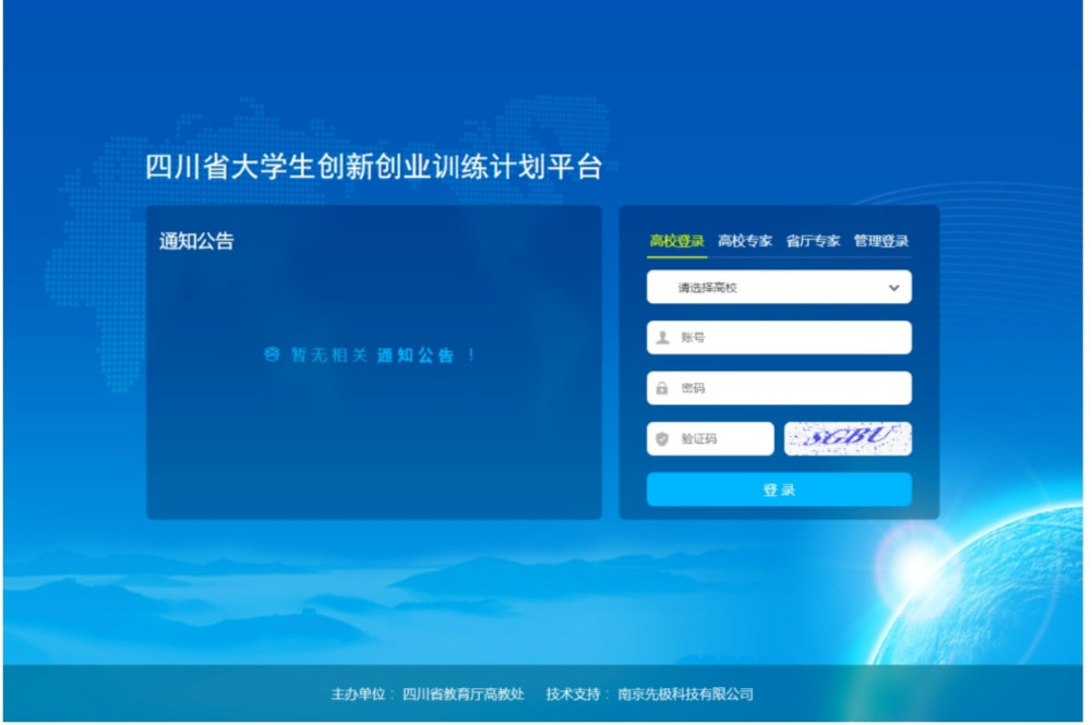 指导教师在浏览器地址栏输入网址http://114.220.75.43:1000/,选择“高校登录”模块,下拉选择高校,输入高校管理员分配的账号、密码、验证码,登录平台。初始账号为学校分配账号,默认密码为:“账号@cxcy”。我校指导教师的初始账号为教师的工号,默认密码为:“账号@cxcy”。