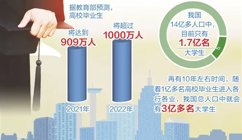 但也要看到,高等教育进入普及化时代,大学生数量大幅增长,就业形势就会发生变化。根据教育部预测,2021年高校毕业生将首次突破900万人,达到909万人,再下一届毕业生将超过1000万人。