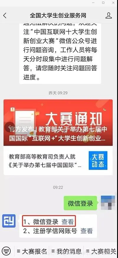 ②绑定微信进入微信公众号后,输入关键词“微信登录”,公众号将自动回复登录入口,完成学信网账号与微信账号绑定流程并保持登录状态。