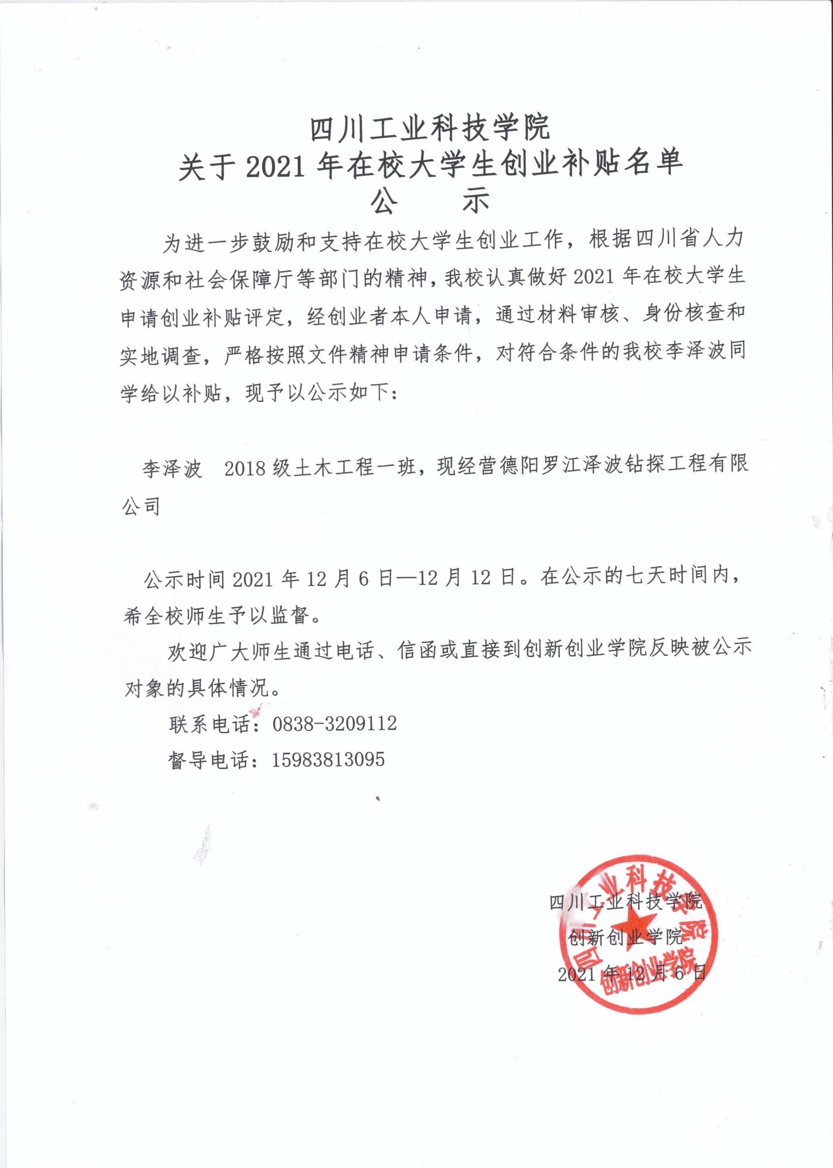 四川工业科技学院关于2021年在校大学生创业补贴名单公示