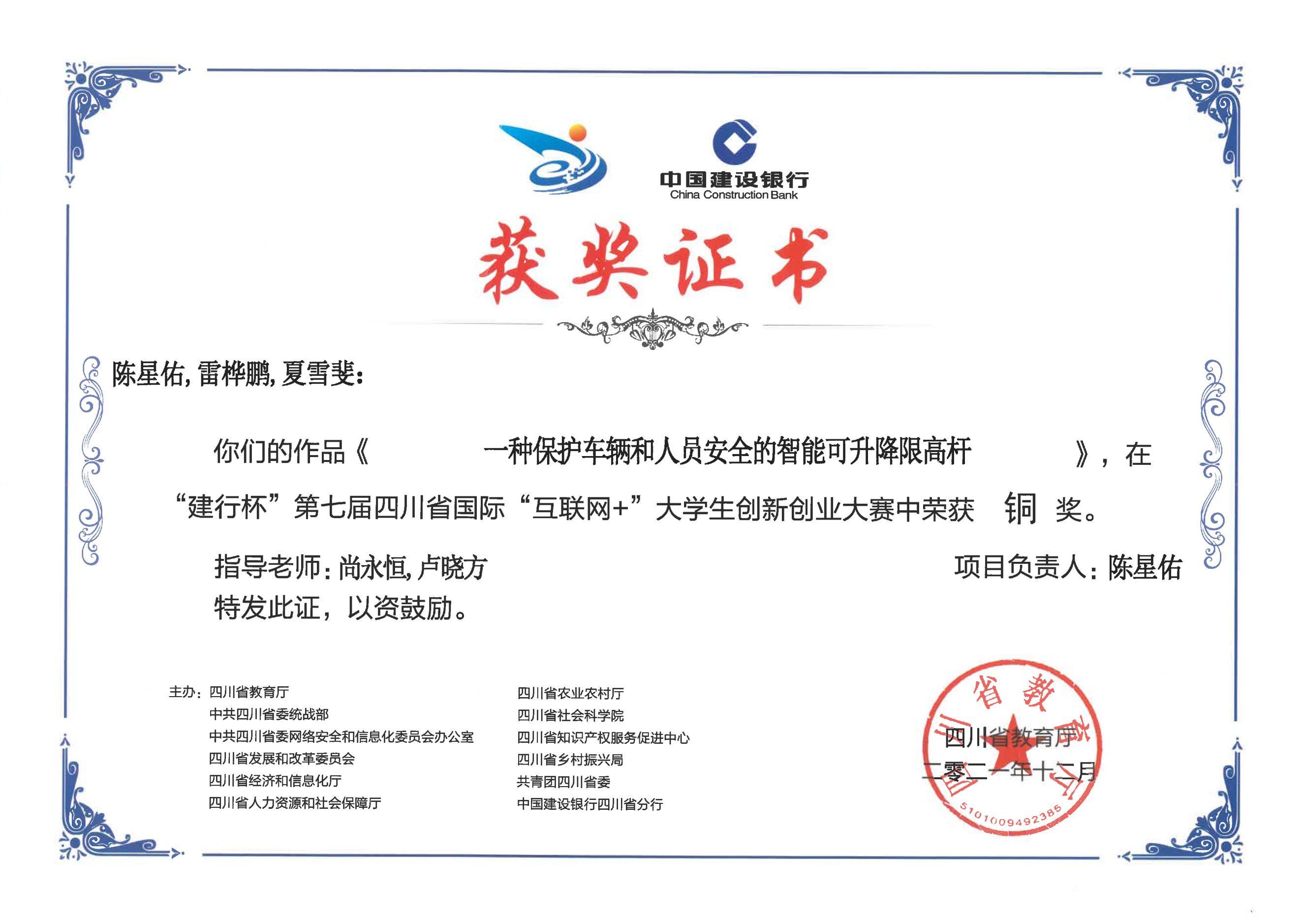 近日,四川省教育厅公布了第七届四川省“互联网+”学生创新创业大赛决赛获奖项目名单,我校陈星佑、雷桦鹏、夏雪斐同学《一种保护车辆和人员安全的智能可升降限高杆》项目和李鸿浒、母鸿坤、帅杨同学《基于树莓派的人脸识别系统的设计》2个项目分获铜奖。