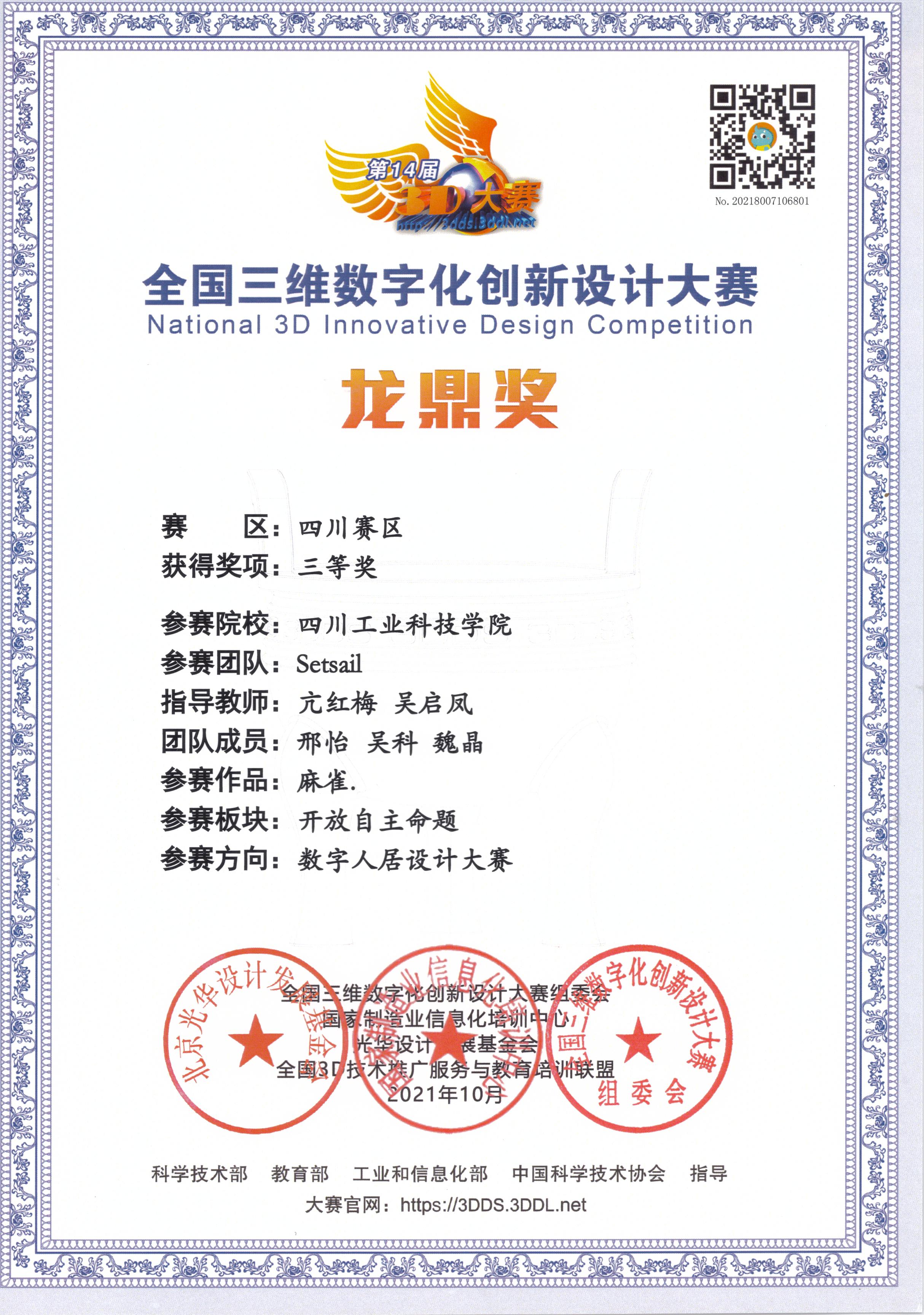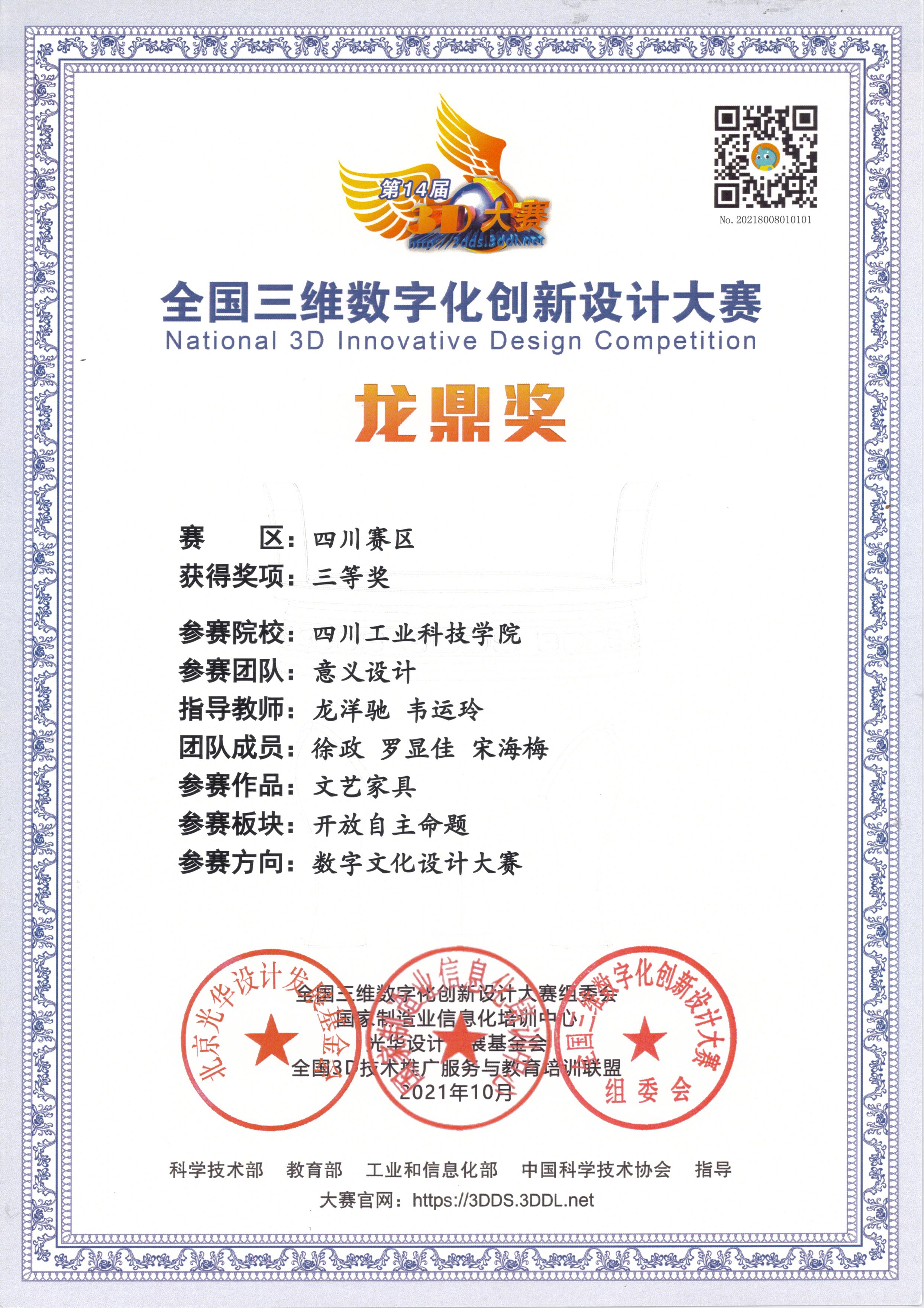 近日,由我校创新创业学院组织的万昕、黄会、沈凤菲同学作品《nutshell工作室》,赵国安、廖培崧、苏禹、邓静、吕瑞琪同学作品《数字展览馆》;邢怡、吴科、魏晶同学作品《麻雀》,徐政、罗显佳、宋海梅同学参赛作品《文艺家具》四个项目分别荣获第14届全国三维数字化创新设计大赛四川赛区两个二等奖及两个三等奖。