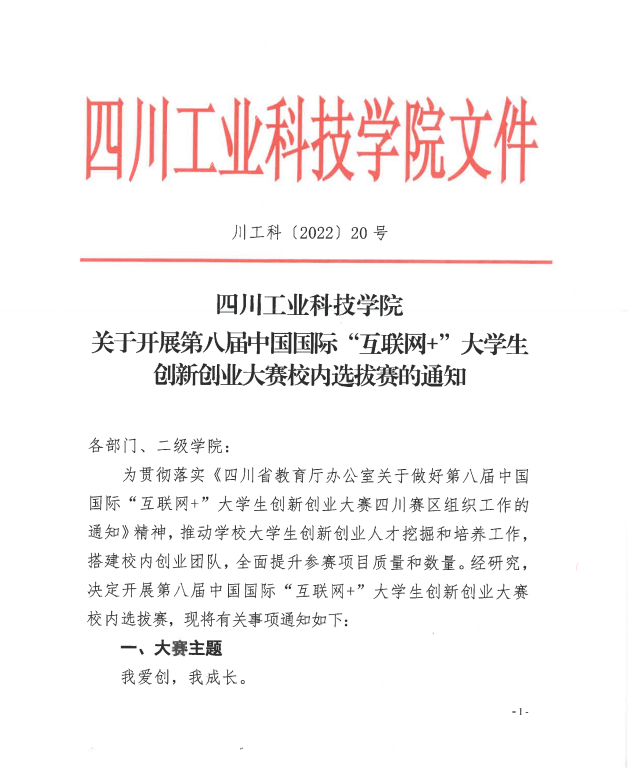 四川工业科技学院关于开展第八届中国国际“互联网+”大学生创新创业大赛校内选拔赛的通知