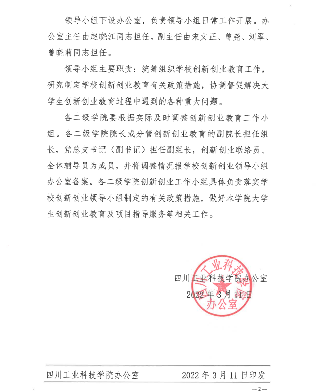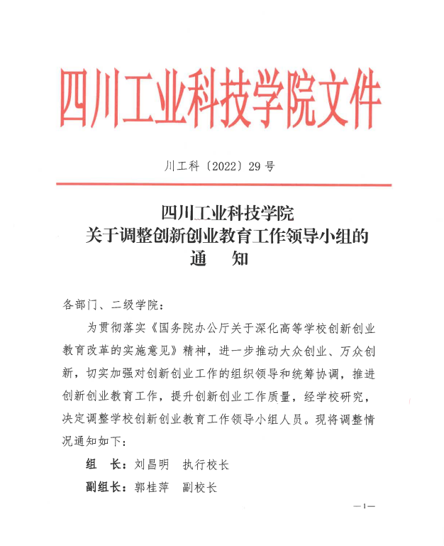 四川工业科技学院关于调整创新创业教育工作领导小组的通知