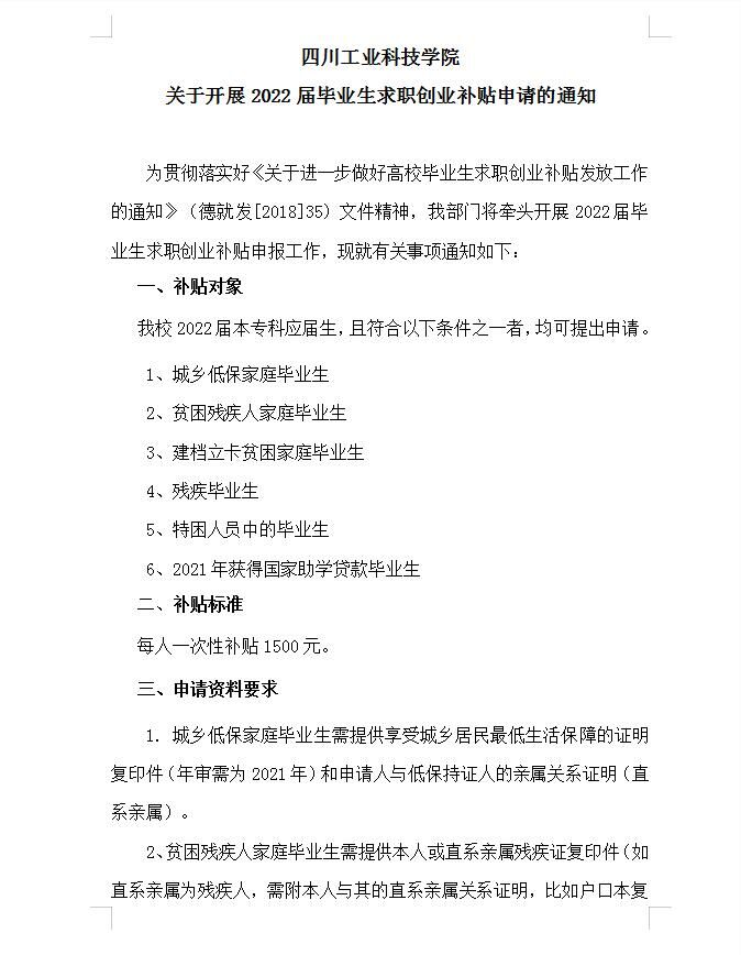四川工业科技学院关于开展2022届毕业生求职创业补贴申请的通知