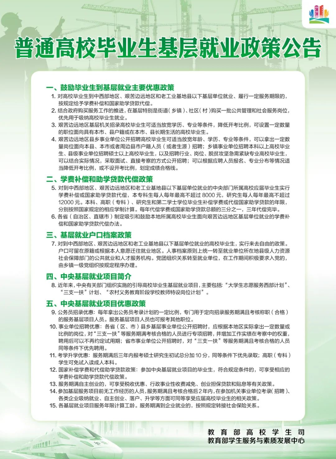 本期推送《普通高校毕业生基层就业政策公告》,内容涉及鼓励毕业生到基层就业主要优惠政策、学费补偿和助学贷款代偿政策、基层就业户口档案政策、中央基层就业项目简介、中央基层就业项目优惠政策等内容。