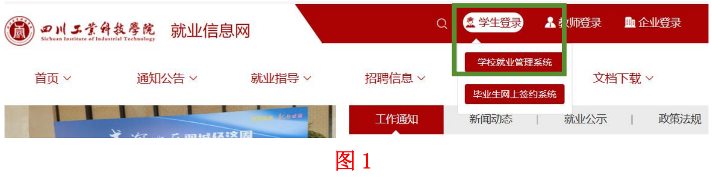 (一)在浏览器中输入 https://scgykj.jiuyeb.cn 进入四川工业科技学院就业信息网,选择网页导航顶端“学生登录”的“学校就业管理系统”,进入学生端的登录页面。如图 1、图 2 所示