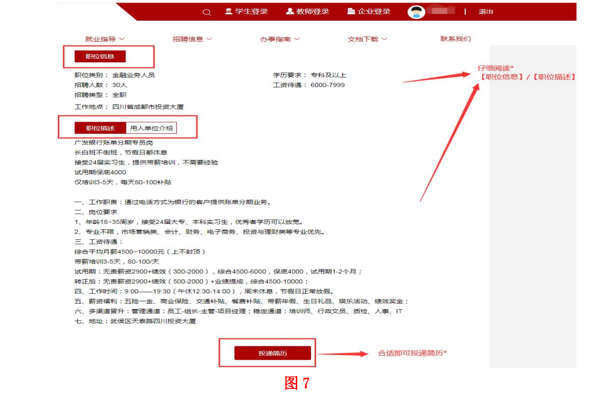 3.投递简历。点击某招聘企业进入岗位介绍页面,仔细阅读“岗位信