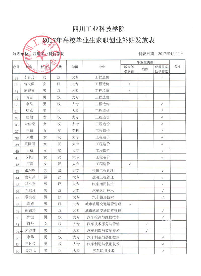 关于拟定2017年高校毕业生求职创业补贴名单公示