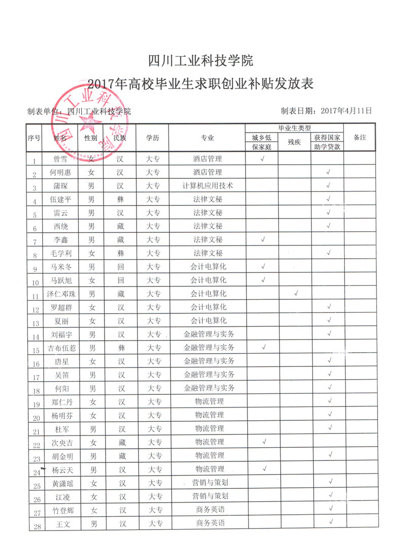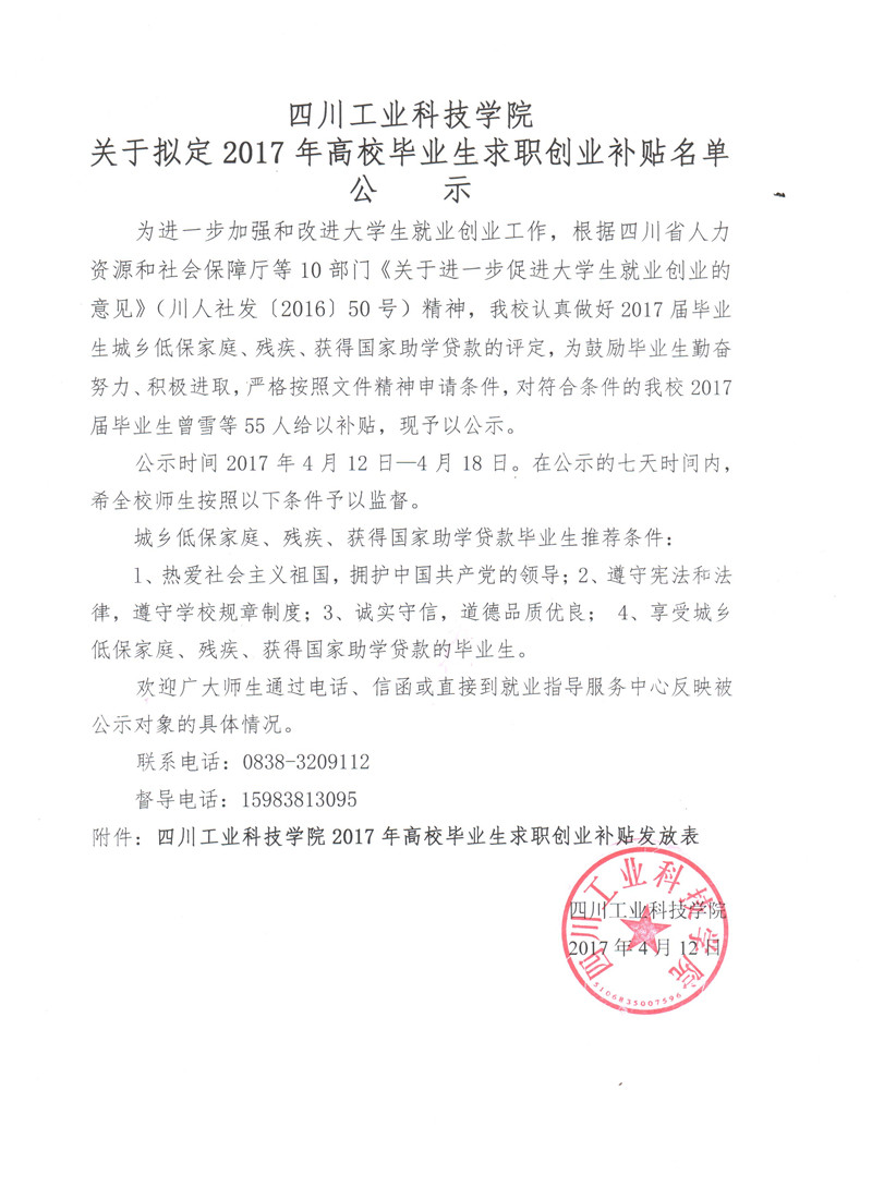 关于拟定2017年高校毕业生求职创业补贴名单公示
