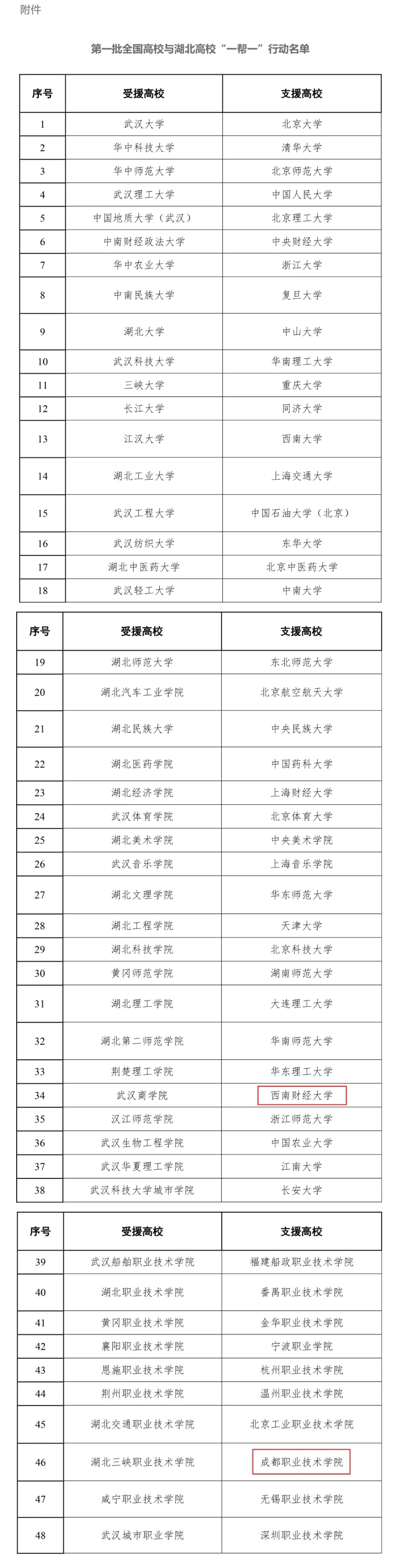 “一帮一”行动充分考虑了学校办学类型、就业工作特点和受援高校需要。首批确定48对高校开展帮扶行动,支援高校包括34所中央部委直属高校(含30所教育部直属高校)、4所省属普通高校、10所全国示范性高职院校;湖北受援高校包括8所中央部委直属高校(含7所教育部直属高校)、30所省属本科院校、10所高职院校。帮扶行动时间定为2020年4月至9月,并将根据疫情防控安排适时调整。