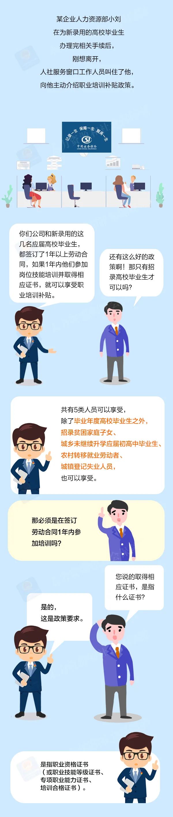 对企业新录用贫困家庭子女、毕业年度高校毕业生、城乡未继续升学应届初高中毕业生、农村转移就业劳动者、城镇登记失业人员等五类人员,签订1年以上期限劳动合同、并于签订劳动合同之日起1年内,参加岗位技能培训的,取得职业资格证书后给予职工个人或企业职业培训补贴。