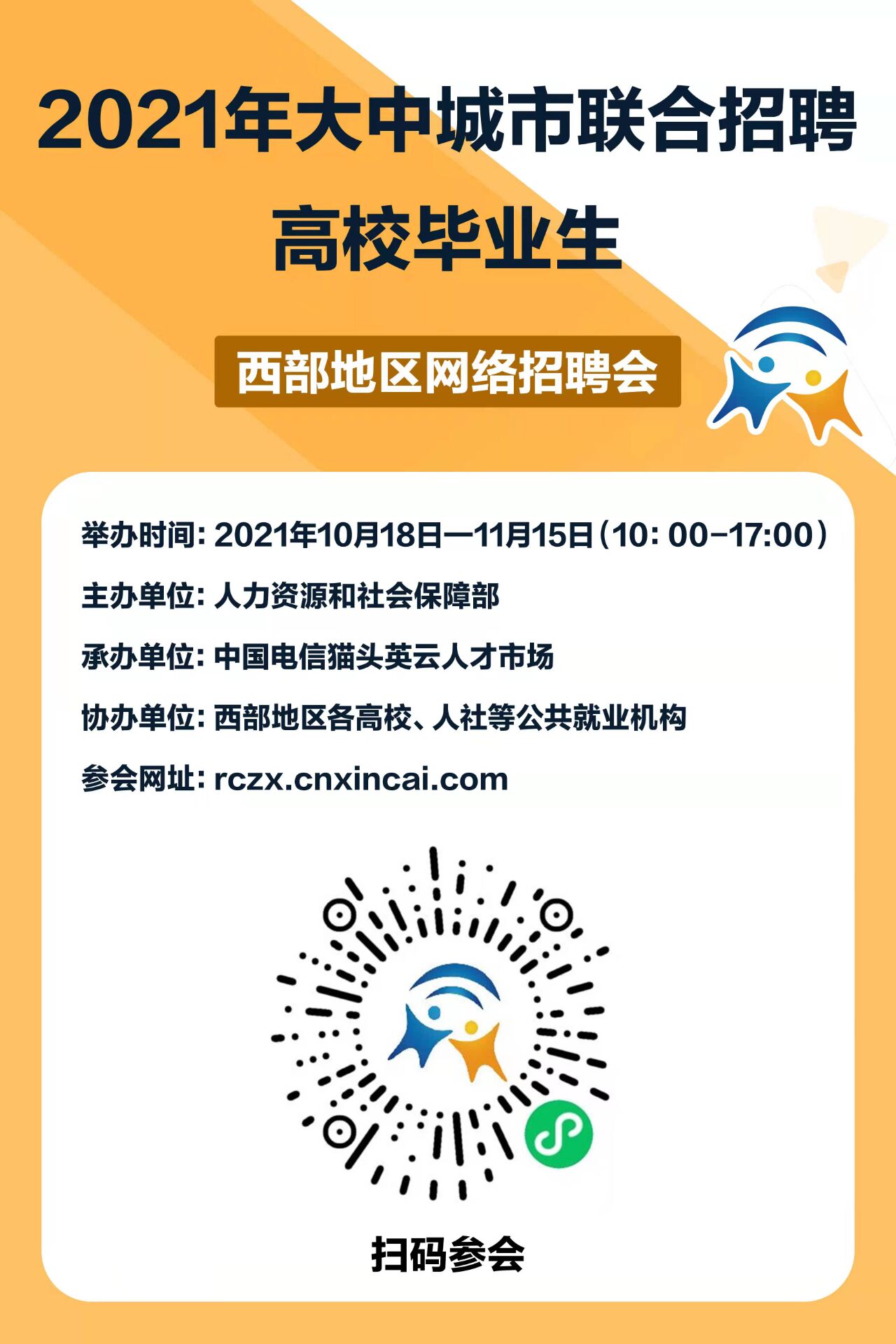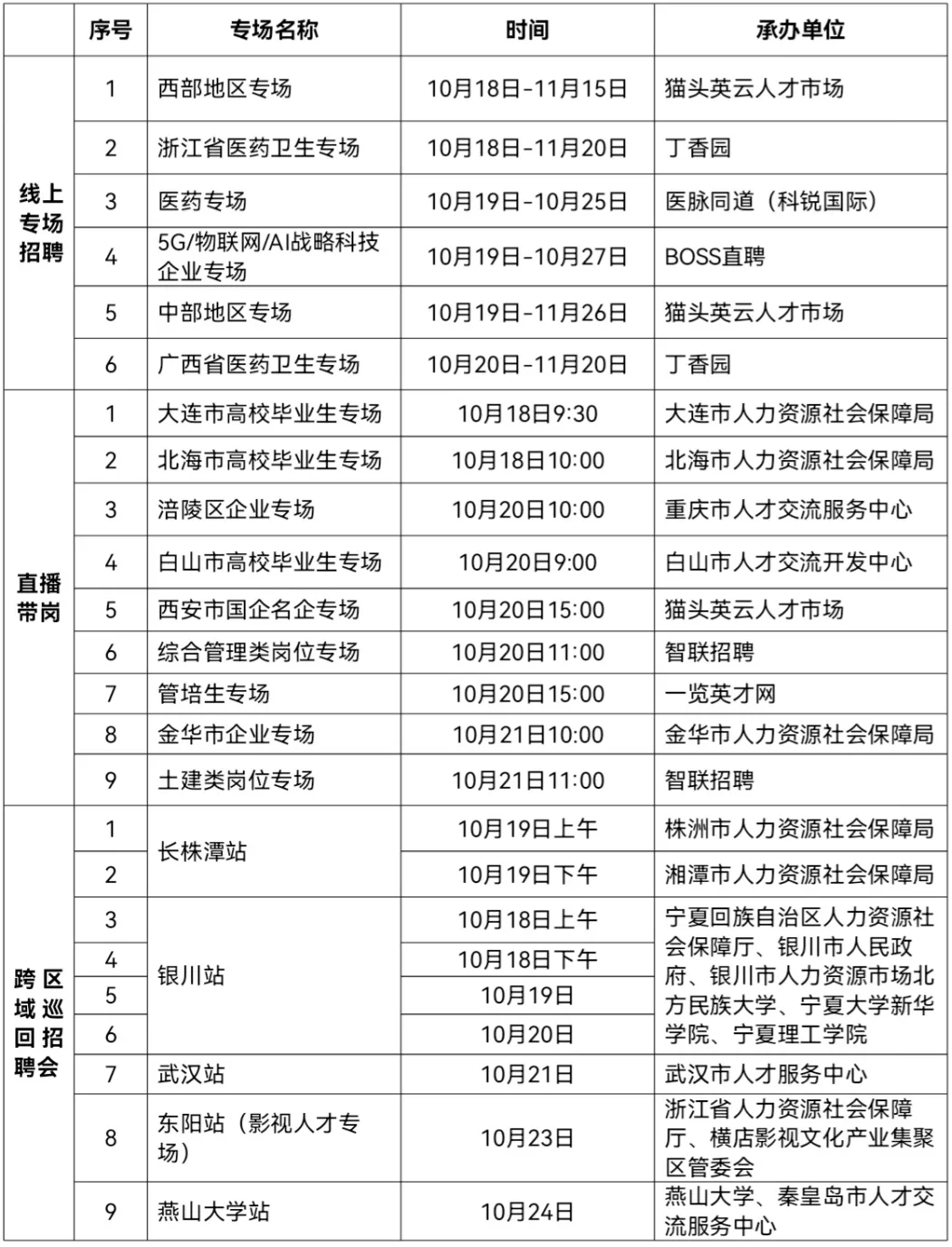线下活动9场:举办长株潭站(2场)、银川站(4场)、武汉站、东阳站、燕山大学站等9场跨区域巡回招聘会,除本地用人单位外,将邀请外省市人社部门组织用人单位组团参加。