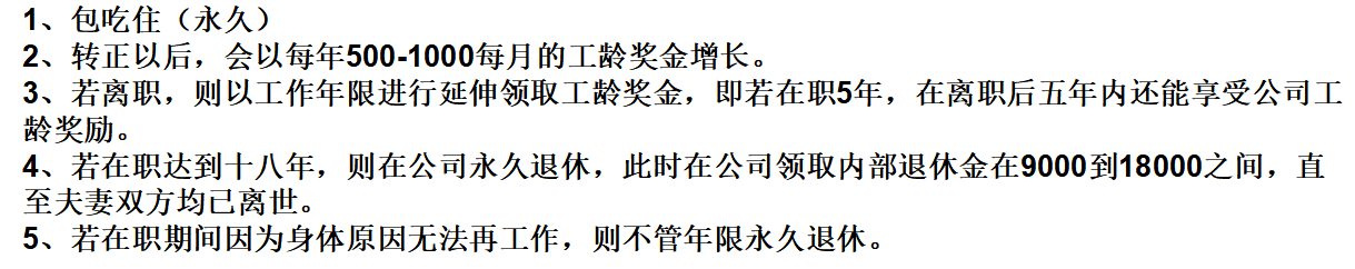 五、福利待遇:为保证签约人员收入持续良性的增长,公司有相应的内部评审制度,根据评审结果,签约人员在除岗位收入外,会以每签约期满一年500-—1500元/月的奖励进行增长,上不封顶,领取时间在成为签约人员的第二年开始每年领取,此奖励在解约后依然可以继续领取,具体持续领取时间和签约时间相同。(如在公司签约3年,在解约后还能持续领取3年,若签约5年,解约后仍可持续领取 5 年)
