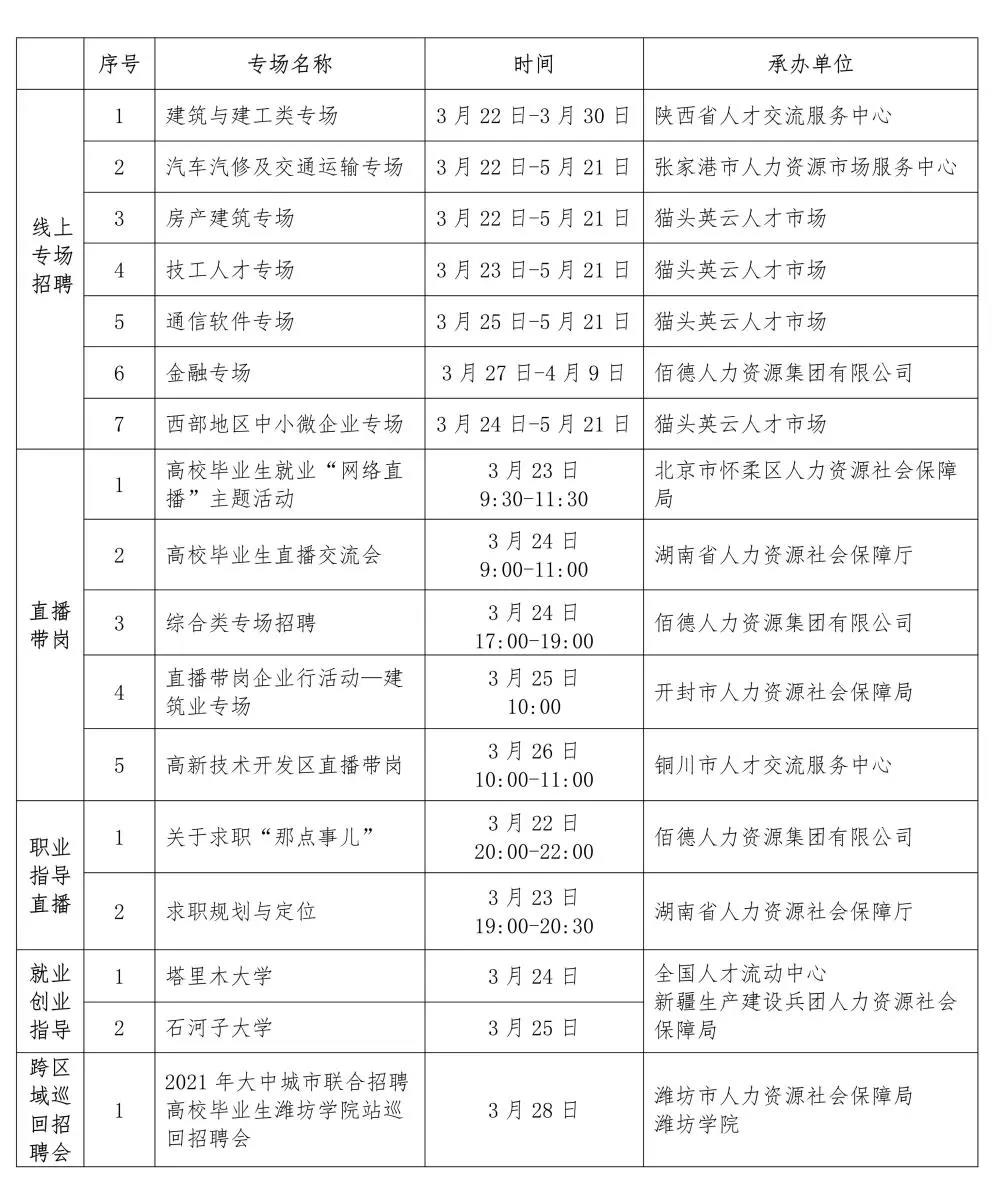 人社部2021年大中城市联合招聘高校毕业生春季专场活动近期将推出第二批17场特色服务活动。