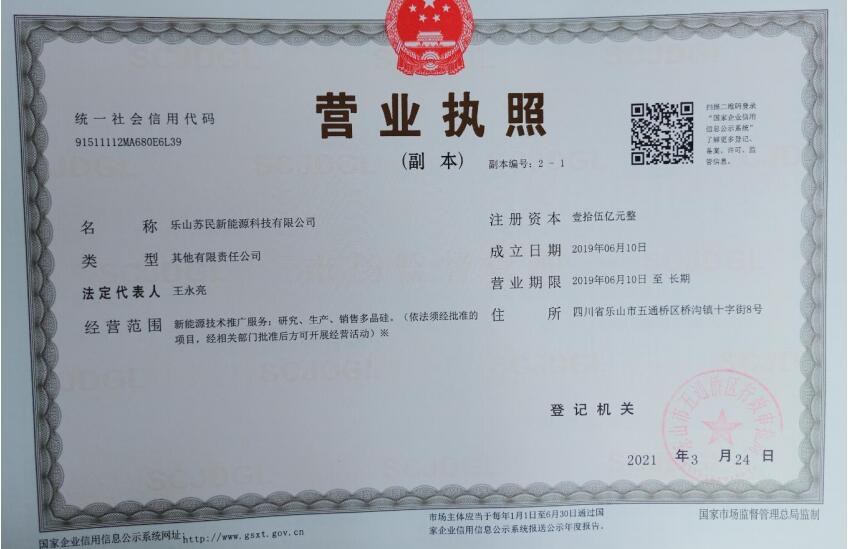 旗下乐山苏民新能源科技有限公司成立于 2019 年 6 月,注册资本金