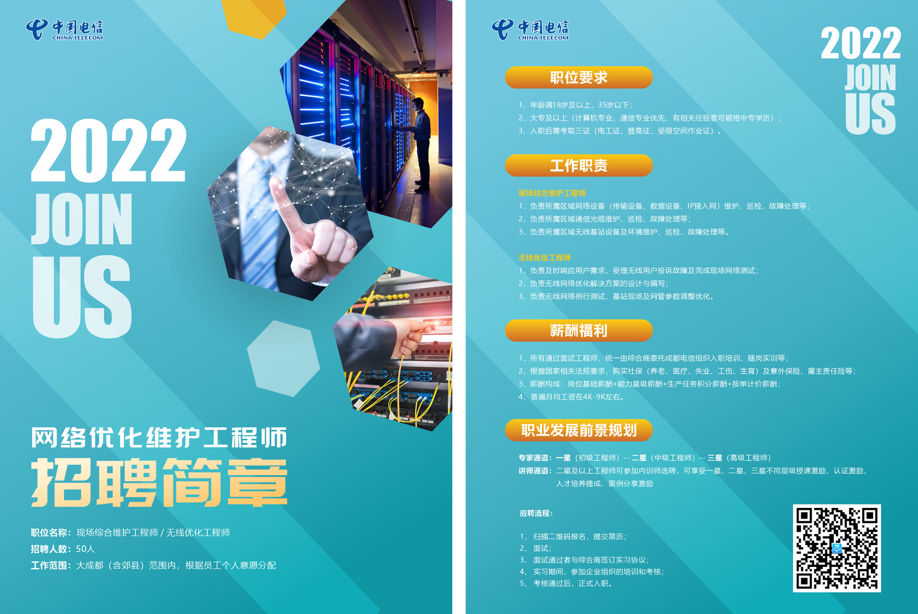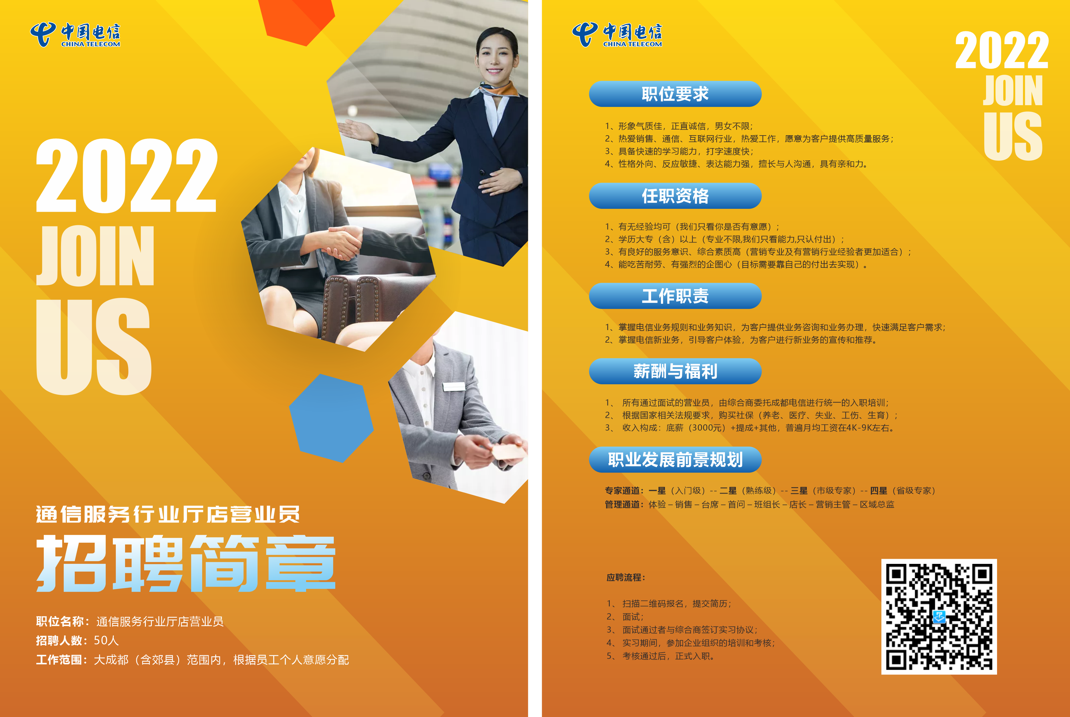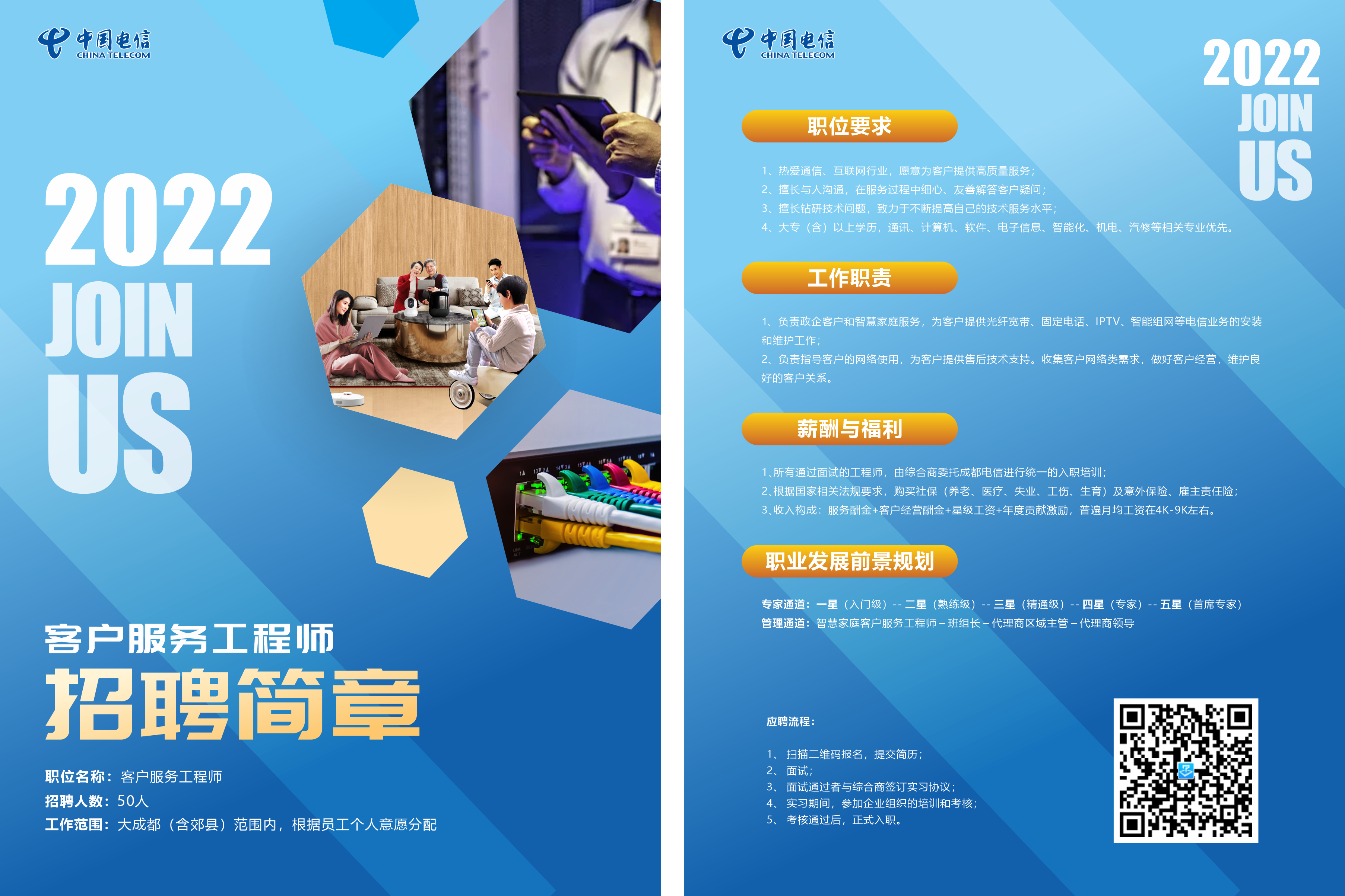 中国电信四川公司22年通讯服务厅店营业员、客服服务工程师、装维客户工程师招募中,营业员不限专业,其余两个岗位主要是通讯、计算机、软件、电子信息、智能化、机电、汽修等相关专业均可。