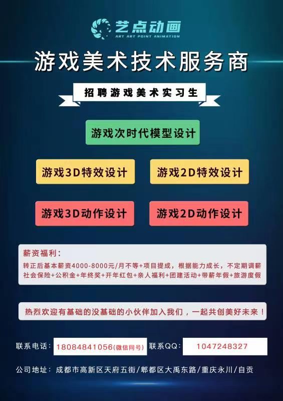 招聘要求:需要一定的美术基础,对使用U3D引擎、flash,AE,spine等软件有兴趣,愿意从事特效工作,对该工作内容有浓厚的兴趣;公司提供岗前培训
