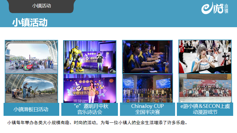 e游小镇是绍兴建设“创新之区”的重要载体,于2016年1月被列入第二批 省级特色小镇创建名单,是当前浙江省重点培育的108个省级特色小镇之一, 主要培育游戏、影视、动漫、电竞、网红直播等为泛娱乐信息经济企业,目 标是通过3-5年的努力,打造成为引领全国的网络游戏之都、长三角数字内容 创意产业中心和全省互联网应用示范小镇。 e游小镇取名,包涵多重意义。“e游”的“e”是信息技术、信息经济的代 名词,“游”代表游戏等泛娱乐信息经济产业,“e游”连在一起谐音“一 流”,寓意将e游小镇打造成为一流特色小镇的美好愿景和坚强决心。镇总面积2.8平方公里,核心区块1平方公里,打造“一轴三心四 区”,即以串联各功能区的复兴路为轴线,以小镇客厅、互联网创 新中心、文化竞技中心为三个中心,按照“区域联动、中心构筑、 轴带串联、水绿渗透”,着力打造游戏综合体验区、互联网创意产 业区、文化艺术展示区和生活配套服务区四个功能区域。