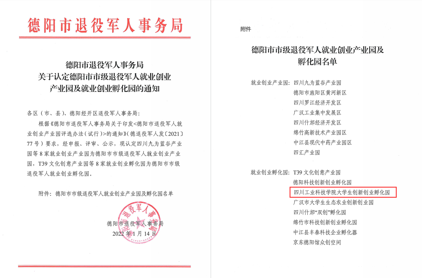 学校孵化园认定为德阳市市级退役军人就业创业孵化园