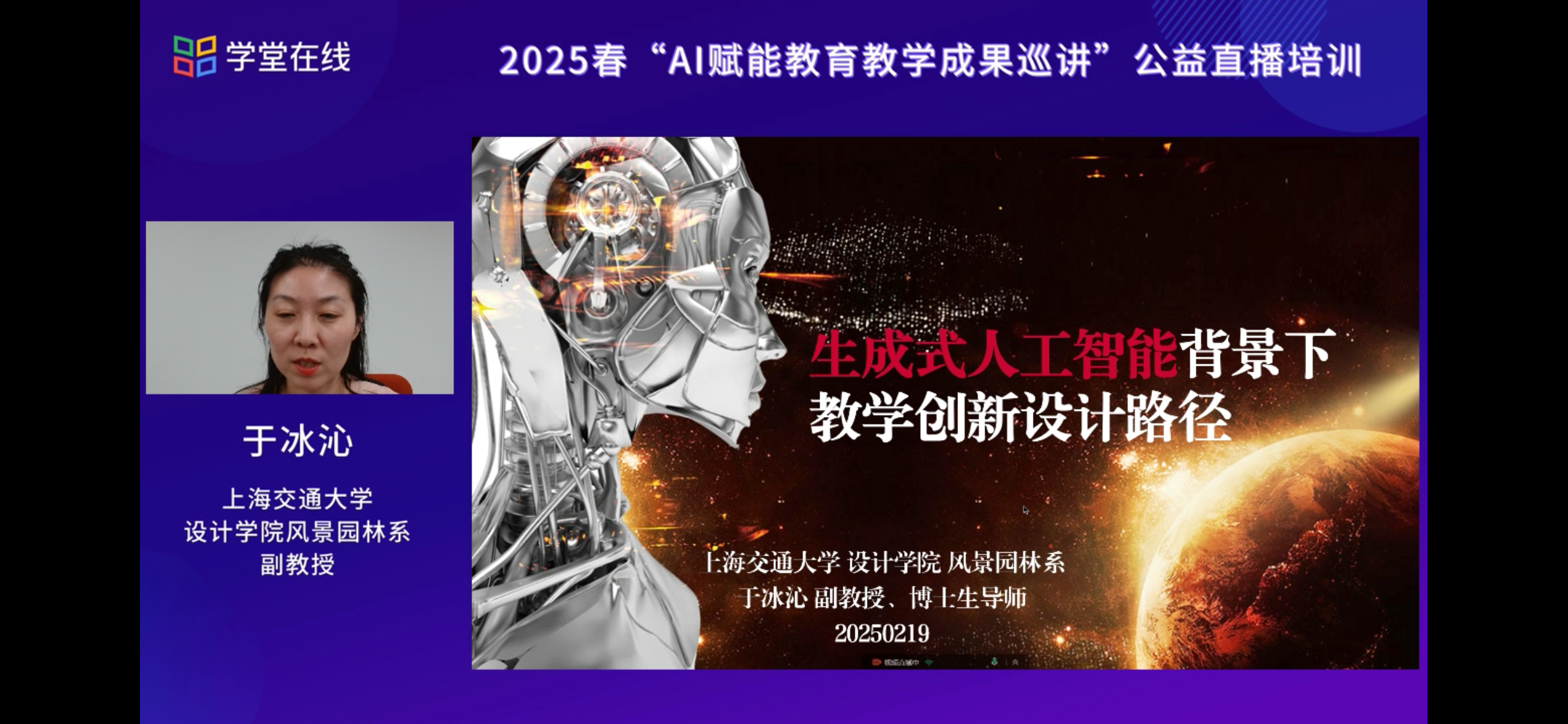 2月19日,学校组织全校无课教师参加了由雨学堂在线平台举办的“AI赋能教育教学成果巡讲”公益直播培训。本次培训特别邀请了上海交通大学设计学院风景园林系副教授于冰沁,就风景园林专业的改革与教学创新设计进行了深入讲解。