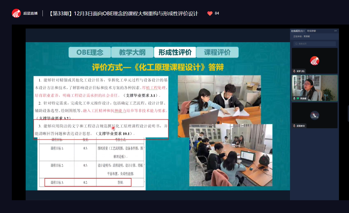 12月3日下午,学校教师教学发展中心组织无课教师参加了超星【师享汇】第三十三期网上直播讲座。本次讲座特邀天津科技大学贾原媛教授,分享了题为“面向OBE理念的课堂大纲重构与形成性评价设计”的专题报告,吸引了全校各院系近百名教师在线参与学习。