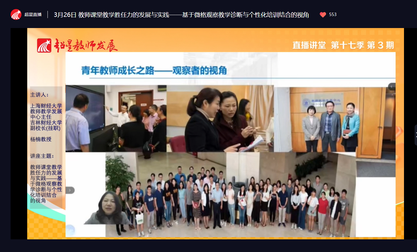 3月26日下午,学校教师教学发展中心组织全校无课教师参加超星教师发展直播讲堂第十七季第3期线上培训活动。本期讲堂特邀上海财经大学教师教学发展中心主任、吉林财经大学副校长杨楠教授作题为《教师课堂教学胜任力的发展与实践——基于微格观察教学诊断与个性化培训结合的视角》的专题讲座。