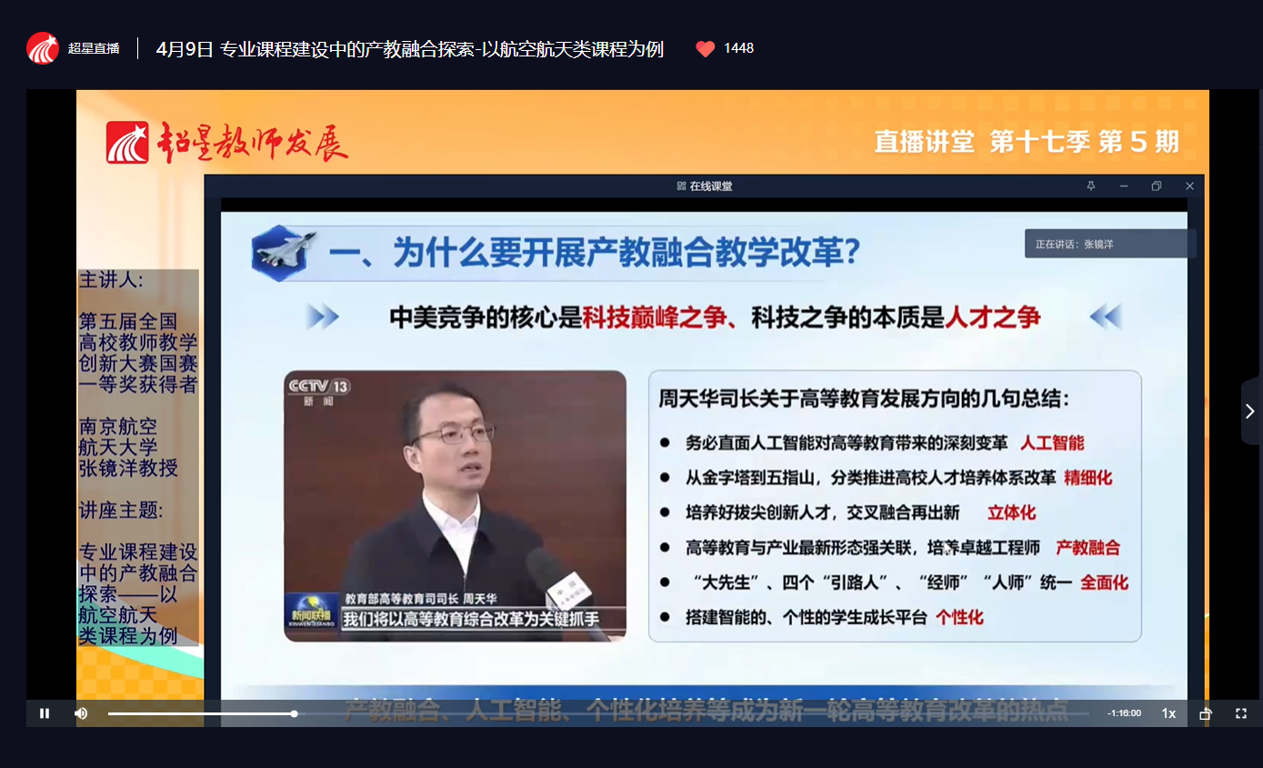 4月9日下午,学校教师教学发展中心组织全校无课教师参加超星教师发展线上直播讲堂第十七季第5期活动。本期讲堂特邀第五届全国高校教师教学创新大赛产教融合赛道全国一等奖获得者、南京航空航天大学张镜洋教授,以航空航天类课程为例,作题为《探索专业课程建设中的产教融合》的专题分享。