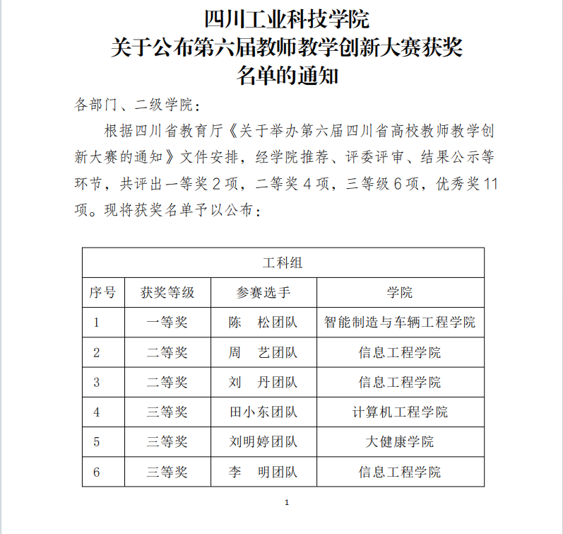 四川工业科技学院关于公布第六届教师教学创新大赛获奖名单的通知