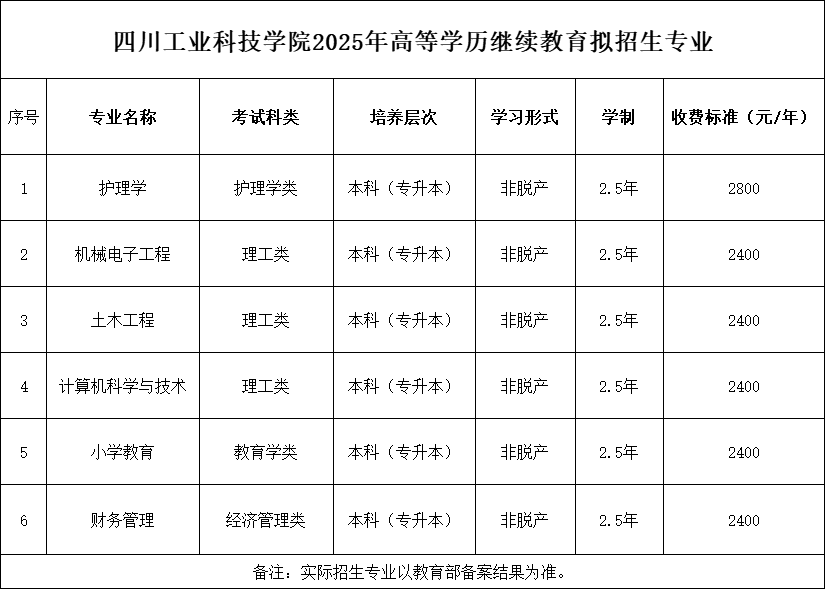 四川工业科技学院2025年高等学历继续教育拟招生专业