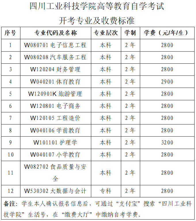 四川工业科技学院高等教育自学考试开考专业及收费标准