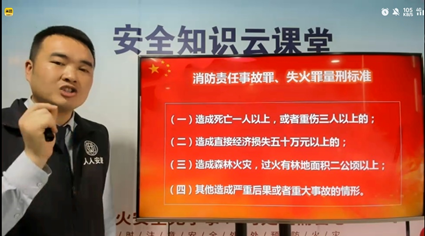 直播课堂中,消防宣教专家通过分析近期重大事故真实案例,向大家阐述了火灾引起的严重后果及遇紧急突发情况时该如何组织职工及学生进行安全疏散。另外,消防宣教专家还讲解了重点场所用电用气的注意事项及防火要求、消防隐患的排查及解决、消防设施的规范配置及正确使用方法、差旅途中及公众聚集场所的安全防护措施等安全知识。