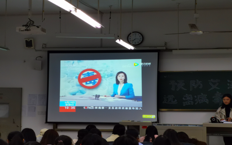 马林雨同学播放有关艾滋和毒品的APP供同学们观看,并提问。讲解中重点强调艾滋病的病症及传播途径。对现在较新型的毒品种类进行了重点讲述包括神仙水、0号胶囊、奶茶、迷幻蘑菇等等。同时,向我们提出了几点预防,远离毒品的建议。