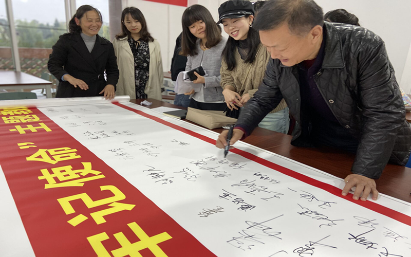 会议最后,学院全体党员教师在“不忘初心,牢记使命”主题横幅上郑重签上自己的名字。