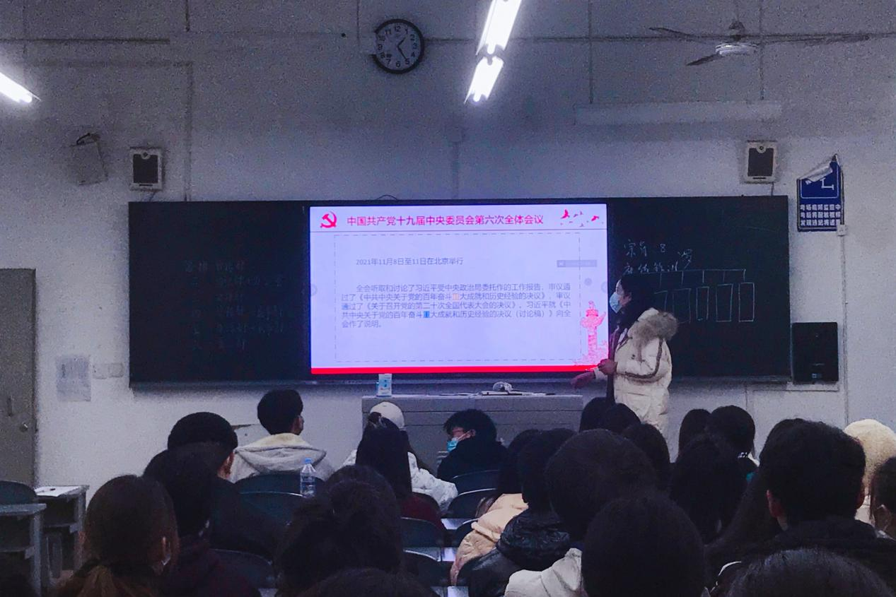 会议伊始,学工办主任黄译漫对本期学生会工作进行了系统的总结,在肯定大家工作的同时对不足的地方提出了建议。随后廖佳音老师带领学大家学习了党的十九届六中全会会议公报,她指出全会通过的《中共中央关于党的百年奋斗成就和历史经验的决议》是一篇马克思主义纲领性文献,是新时代中国共产党人的政治宣言,是实现伟大复兴中国梦的行动指南,对党的百年奋斗重大成就和历史经验进行了总结和回顾。随后,廖老师对贯彻九届六中全会精神提出了具体要求,首先, 学生会作为党领导下的主要学生组织,要把学习宣传贯彻党的十九届六中全会精神作为当前首要的工作任务,从历史经验规律中汲取精神伟力,特别是把“十个坚持”作为团学工作的根本遵循;第二,学生会要进一步团结和引导广大同学坚定不移听党话、跟党走,努力成长为能够担当民族复兴大任的时代新人。