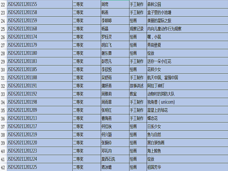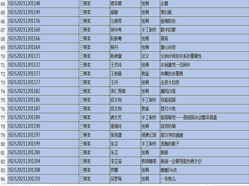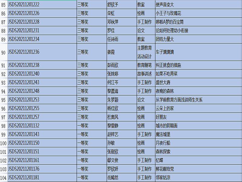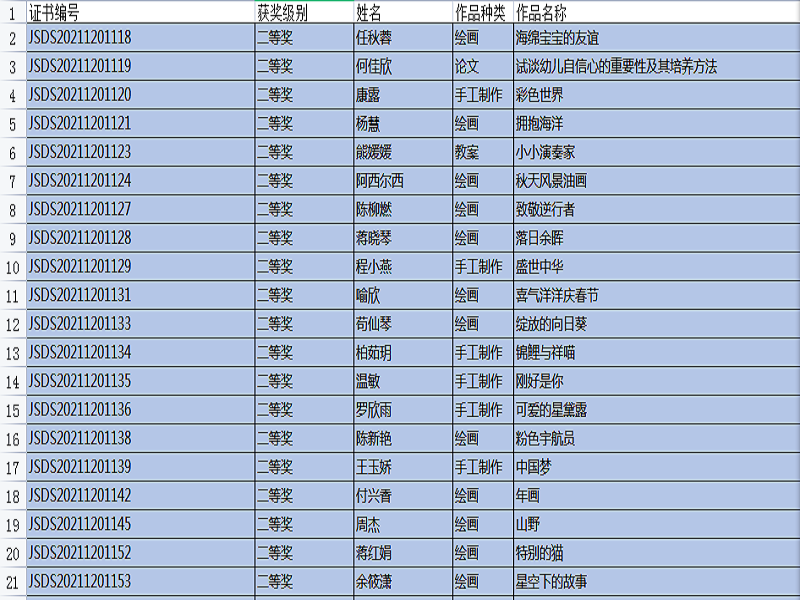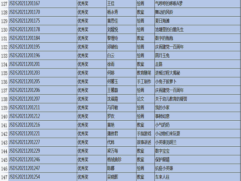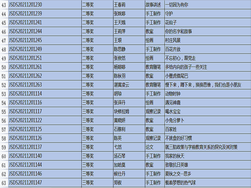 “全国幼儿教师职业技能大赛”,是幼儿教师培养工作的重要组成部分,是促进教育质量提高的重要途径,是教师分享、交流、进步的平台,也是教师完善自我、提升自我、超越自我的体现。本次比赛主题是:创新,源于对教育的感悟,比赛时间从9月开始一直延续到11月中旬结束,比赛项目有: 教案、说课稿、教育随笔、观察记录、案例分析、论文、半日活动设计、主题教育活动设计、手工制作、绘画、故事讲述、手指游戏,共12项。在12月20号刚刚公布的成绩中,我院学生通过激烈的竞争和角逐,所有参赛作品均获奖。其中,一等奖20份,二等奖51份,三等奖45份,优秀奖35份。本次技能大赛的硕果累累,增加了教师之间的专业交流,促进了幼儿教师的职业素养,更好地践行了《纲要》和《指南》精神,也对我院学前教育专业的教学质量交上了一份满意的答卷。
