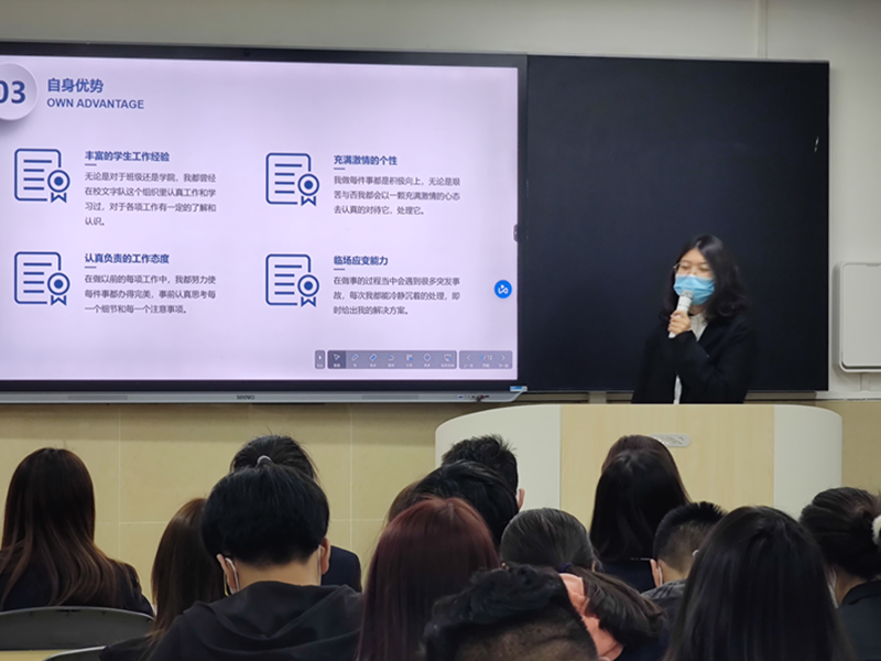 大会在主持人宣读竞选流程后进入了竞选人员做竞职演讲环节。参加竞选的同学通过PPT来展现自己,各个部门都竞争激烈,尤其是参与竞选校语言文字队和推普办的同学们个个文采出众,借用名言或自己写诗来介绍自己,“腹有诗书气自华”,他们向我们展示了语言文字所带来的魅力。竞选主席的同学们也是文采盎然,不疾不徐,自信的对我们做着自我介绍和他们对这份工作的热情和向往。