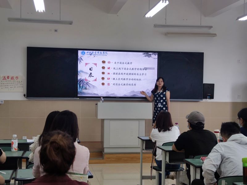 疫情当下,线上线下混合教学模式是保证教学工作顺利开展的必备教学技能,徐伟作为学院教学主任,考虑到我院新教师很多未能熟练地应用超星学习通建课、授课,对超星学习通的很多功能还比较陌生,百忙之中专门开设本次讲座分别从混合式教学介绍、线上线下混合式教学前期准备、课前在线开放课程的自主学习、课上系列教学活动的组织、对混合式教学的思考五个部分对学院全体教师进行集中培训讲解。本次讲座不仅让老师们进一步熟悉了学习通的众多应用功能,更重要的是徐伟主任给全体教师上了一堂生动的课,让老师们从中感受到了她精湛的教学水平。