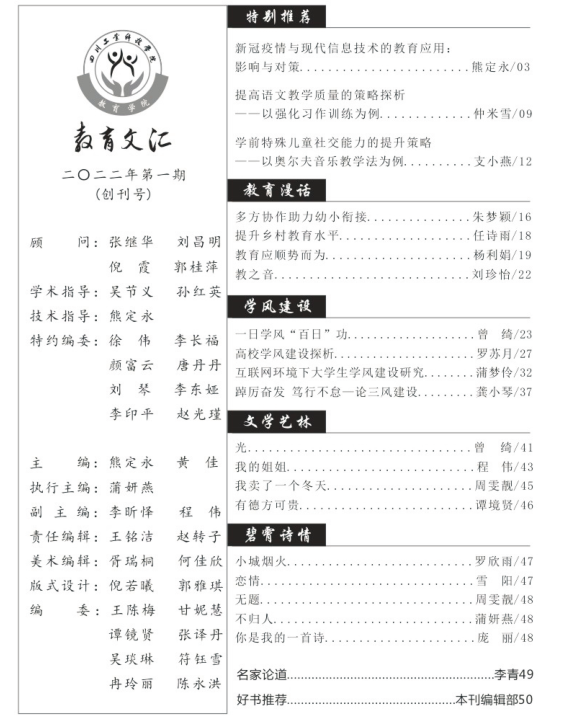 在学院党政的关心支持下,经过编辑部前期的统一规划与精心筹备,教育学院院刊《教育文汇》成功创刊,创刊号于6月下旬正式与师生见面。本期院刊主要设置了特别推荐、教育漫话、学风建设、文学艺术、碧霄诗情、名家论道、好书推荐等栏目或模块。