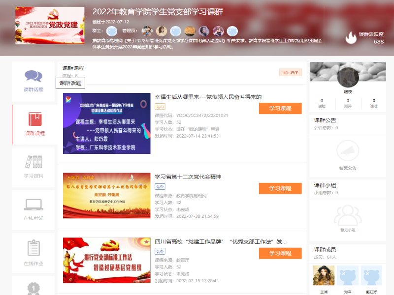 本次课群以学习2022党建知识为主题,借助易班优课平台创建线上活动课群。该课群通过“课群话题”“课群课程”“学习资料”“在线考试”“在线作业”“成绩管理”六个版块分别进行。其中,“课群课程”与“学习资料”两个模块主要围绕党史相关知识与习近平总书记在四川考察时的重要讲话精神、四川省高校“党建工作品牌”、四川省“优秀支部工作法”等方面深入学习。此次活动中新增的“在线作业”板块,要求参加课群的同学提交800字左右的课程学习感悟,以此保证同学们的学习质量,“在线考试”以最终7月底结算线上考试成绩的形式检测同学们的学习效果,此次活动完成度较高,取得了显著影响效果,课群学习人数达59人。