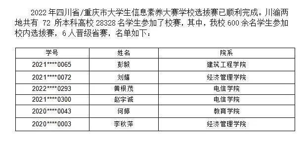 为全面落实立德树人根本任务,切实提高大学生创新精神和信息素养能力,2022年四川省/重庆市大学生信息素养大赛(以下简称“大赛”)初赛于10月22日如期举行。教育学院近60名学子在曾雪老师的指导下,积极备赛,最终我院20级学前教育4班何婷同学21级小学教育15班谢明利同学在我校600多名参赛学子中突出重围,代表四川工业科技学院参加省赛。