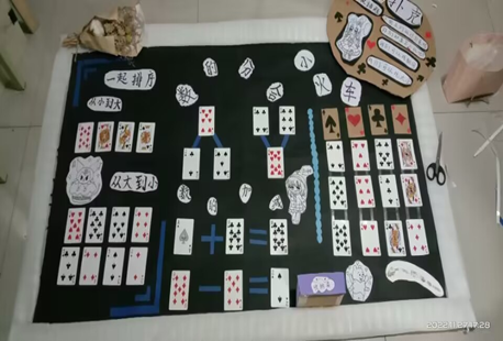 紧接着黑底扑克墙顾名思义是以扑克牌游戏为主。这里的扑克牌游戏不是传统意义上的成人爱玩的娱乐,而是各种符合幼儿年龄阶段,锻炼幼儿数数、算数、比较能力的益智游戏。