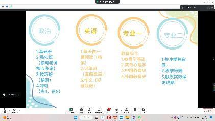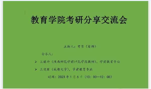 1月6日早上10:00—12:00,教育学院于腾讯会议举办2023年考研动员大会。本次交流会由学前教研室曾雪老师主持,参加此次动员大会的有学前教研室主任唐丹丹老师以及20级学前教育全体本科生。此次动员大会特别邀请了陕西师范学前师范学院王媛琦老师、成都大学王晓丽学姐为我院学子分享考研经验。