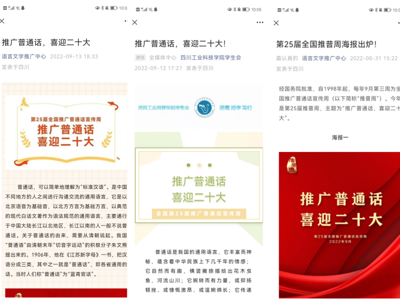 为使推普活动全面、深入开展起来,学校教学楼贴上了宣传标识牌、摆放了“推普”展板、制作了“推普”黑板报。学校还充分利用微信公众号、微博、官网、抖音等新媒体开展活动,让本次“推普”宣传活动在我校全方位覆盖。