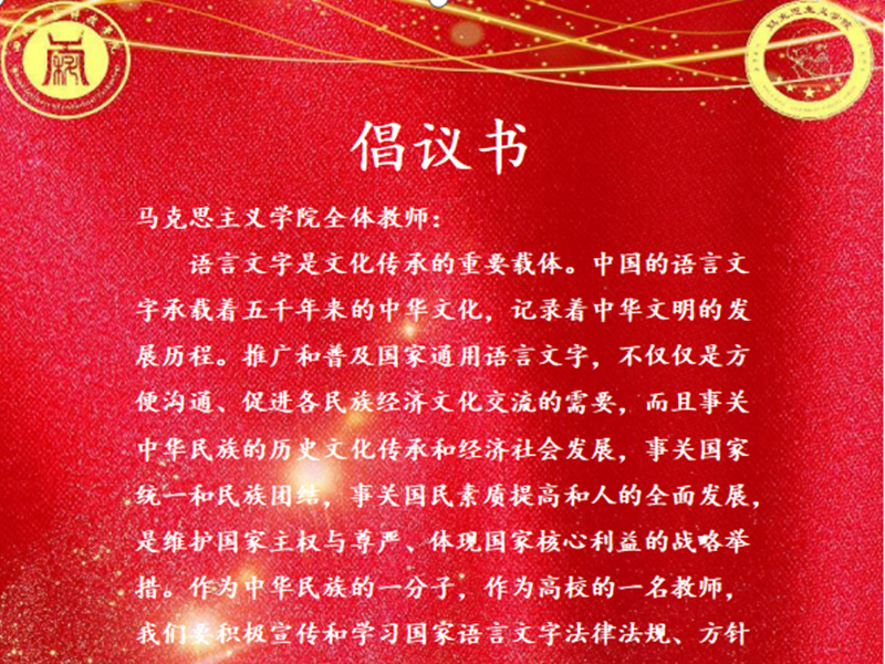 1.以马克思主义学院为代表的教师队伍通过学习《国家通用语言文字法》,深入了解了国家语言文字政策;通过响应推普倡议书,时时处处不忘学普通话、讲普通话;通过自查试卷、教案、会议记录中的一切错别字、繁体字、异体字,从自身做起,形成使用规范文字的良好风气。