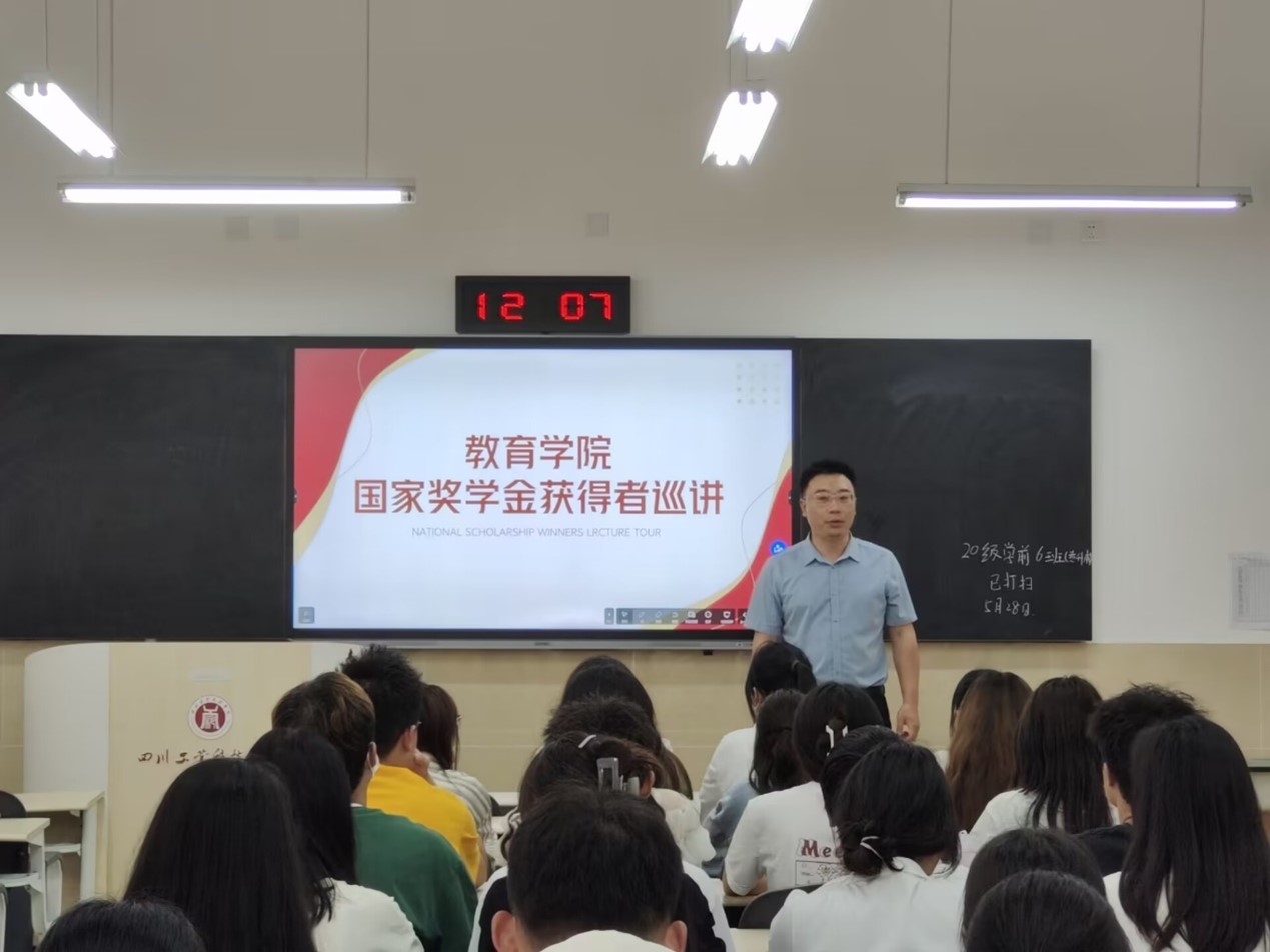 本次演讲由教育学院党总支副书记何彬同志主持,演讲人为本届国家奖学金获得者甘妮慧。甘妮慧围绕大学的学习规划、时间管理、社团活动、科技竞争、志愿服务、社会实践等方面展开分享,向同学们讲述了自己勤勉奋斗和全面发展的青春故事,并结合自身学习生活,从不同角度与现场同学分享了自己的励志故事,充分发挥了先进示范作用。