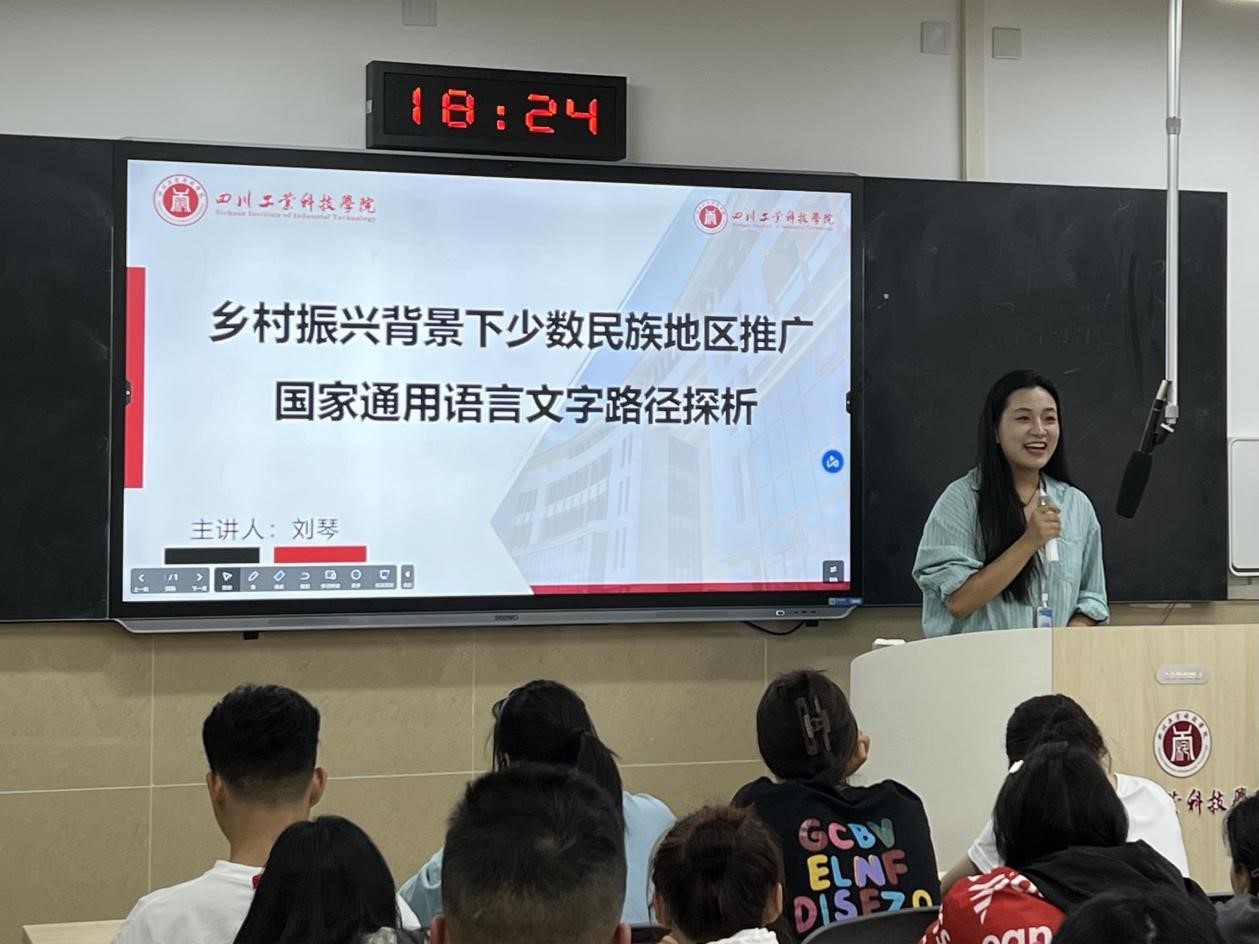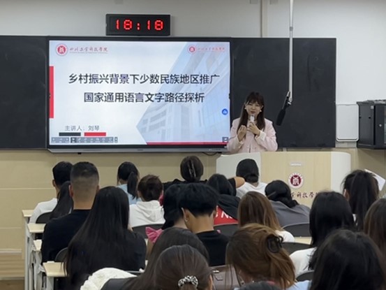 4月15日,在全面推进乡村振兴的大背景下,由四川工业科技学院语委办主办,大学生语言文字推广中心承办,语委办主任刘琴主讲的一场主题为“乡村振兴背景下少数民族地区推广国家通用语言文字路径探析”的专题讲座在龑江D304展开,全校200多名少数民族学生参加。此次讲座旨在深入探讨和推广国家通用语言文字在少数民族地区的应用与发展,进一步推动乡村振兴与文化交流。