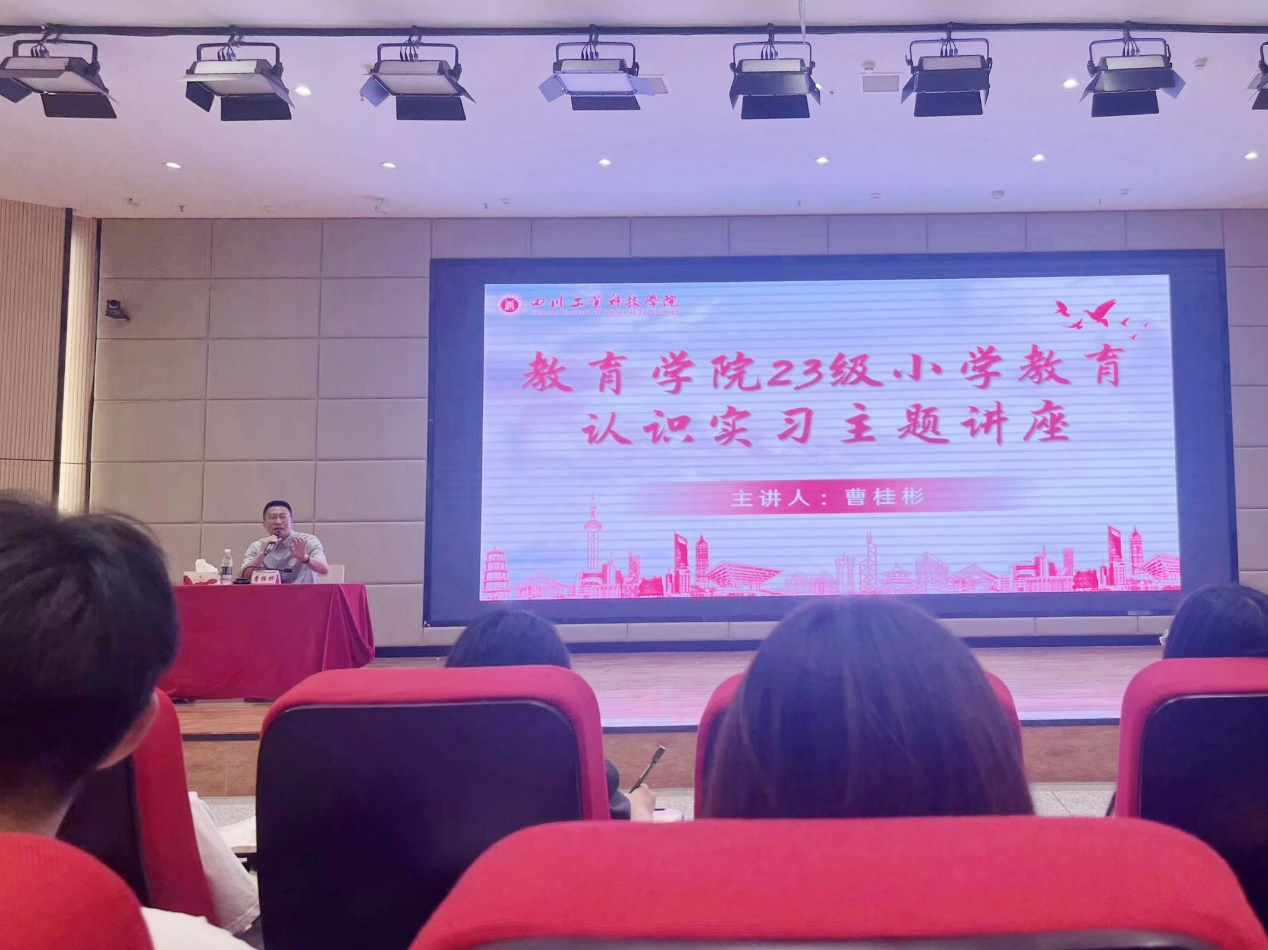 为强化同学们的见习效果,让大家更好的吸收见习中的课程经验和教学技巧,广泛应用于实践之中。教育学院于5月26日晚在c区报告厅开展认识实习主题讲座。本次讲座由教育与艺术教学实习实训中心副主任黄译漫主持,德阳市东电外国语实验小学副校长曹桂彬主讲,23级小学教育专业学生有序参加。