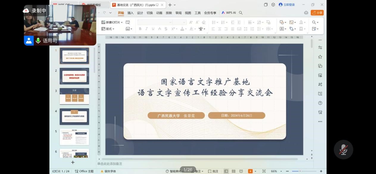 6月26日下午,我校语委办主任刘琴与大学生语言文字推广中心宣传部学生参加了全国语言文字工作通讯员队伍2024年第二季度集中视频培训会议。本次会议旨在通过交流和分享,提升通讯员队伍的专业素养,推动基地工作与宣传推广的协同发展。